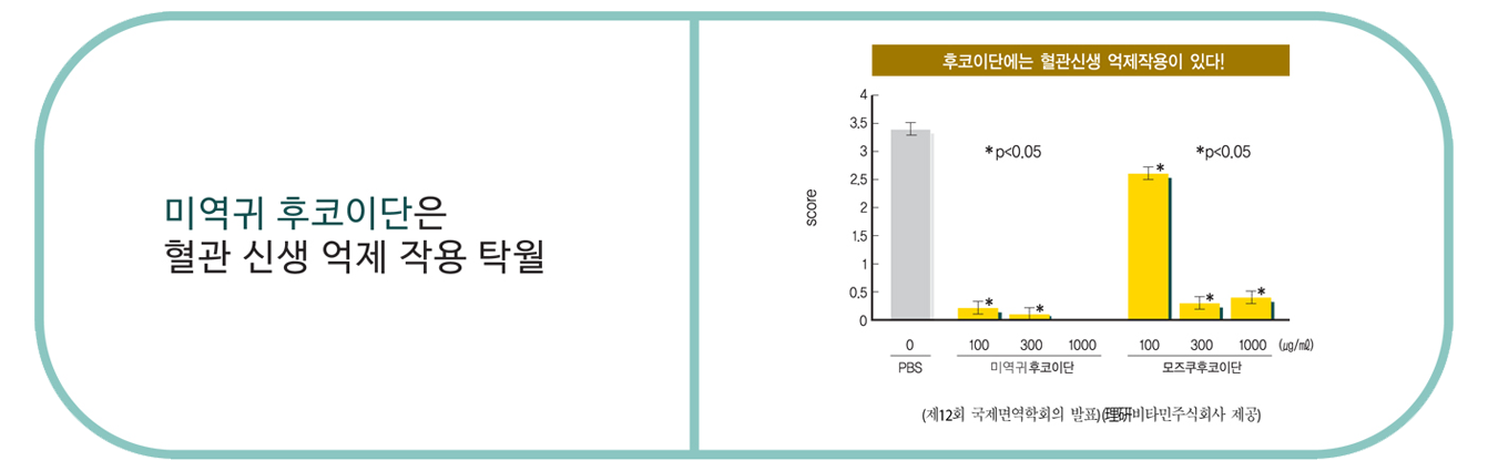 암세포는 새로운 혈관을 만들어 영양분과 산소를 공급받아 빠른 속도로 성장합니다. 또한, 어느정도 혈관이 만들어지면 전이도 시작합니다. 후코이단에는 암세포가 스스로 혈관을 만들지 못하게 하는 효능이 있는 것으로 알려져 있으며, 이를 통해 암세포의 성장과 전이를 억제하는 작용을 합니다.