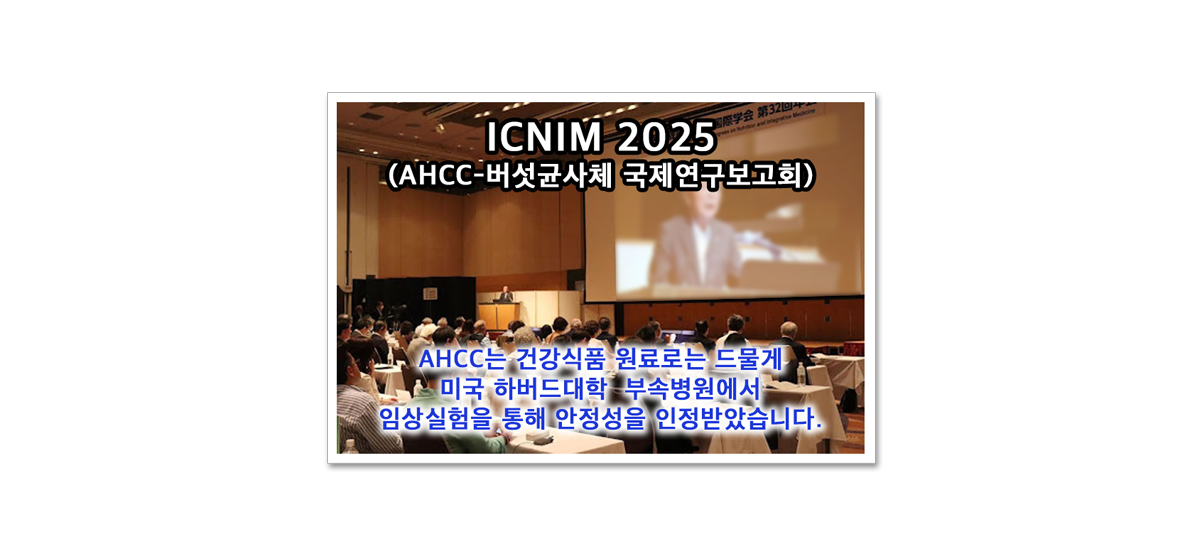 ※ 참고: AHCC는 ‘Active Hexose Correlated Compound’의 약자로, 버섯 균사체에서 추출해낸 아세틸화된 알파글루칸 다당체 성분입니다. 1989년 일본의 아미노업화학주식회사와 일본 도쿄대가 공동 개발한 이후, 하버드 의대, 예일대, 도쿄대, 텍사스 MD앤더슨 암센터 등 세계적인 연구기관에서 면역 활성 작용과 관련된 다수의 연구 결과가 보고되었습니다. 현재 AHCC는 일본 내에서 가장 널리 연구되고 신뢰받는 면역활성 성분 중 하나로, 일본 후생노동성 기준에 따라 준(準) 의약품 수준의 건강성분으로 분류되고 있습니다. 또한 전 세계 700여 개 의료기관에서 AHCC를 면역력 증진과 회복 지원에 도움이 되는 성분으로 활용하고 있습니다.